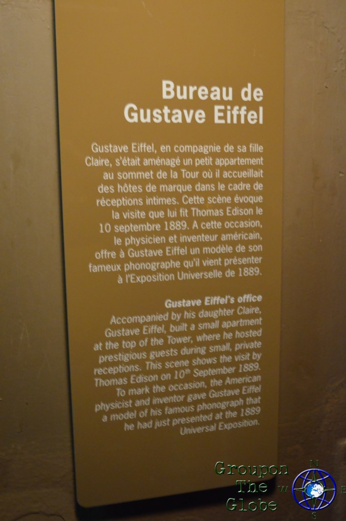 Once we arrived, Joel did the most touristy thing he would do on this trip: he ordered French fries at the concession stand below the Eiffel Tower (I ordered an apple strudel). After waiting in line for at least in hour -and attempting to have a conversation with some locals whom assumed we were French and made fun of Joel’s snack choice – we climbed several flights of stairs, rode a pulley-based elevator and finally reached the top of the Eiffel Tower. The view was amazing! While at the top (which you can purchase different tickets to visit different levels), we could see several Paris landmarks: the Seine River, Notre Dame and The Lourve Museum to name a few. There was also an apartment atop the tower where Gustave Eiffel (the tower’s designer) lived, signs that showed how far away other international cities were located & how other world landmarks compare in height, as well as a restaurant. One of the surprises we didn’t expect was how the tower has a light show at the top of every hour! A collective “Oooh!” could be heard from every visitor. Another surprising thing we noticed were the constant announcements warning visitors that there “are pickpocketers in the tower” and they can easily steal your possessions. Luckily, we didn’t fall victim to any theft.